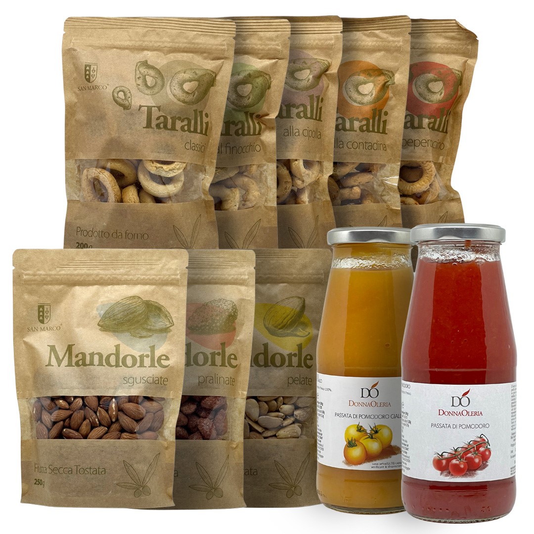Dal gusto deciso dei taralli pugliesi alle note dolci e aromatiche delle mandorle, fino ai profumi intensi delle passate di pomodoro, il kit “Le Delizie” porta sulla tua tavola l’essenza autentica della tradizione salentina.