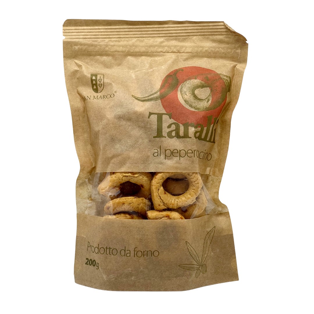 Scegli i taralli pugliesi al peperoncino 200 g Oleificio San Marco e porta sulla tua tavola uno snack croccante, aromatico e dal gusto deciso, perfetto per ogni occasione.