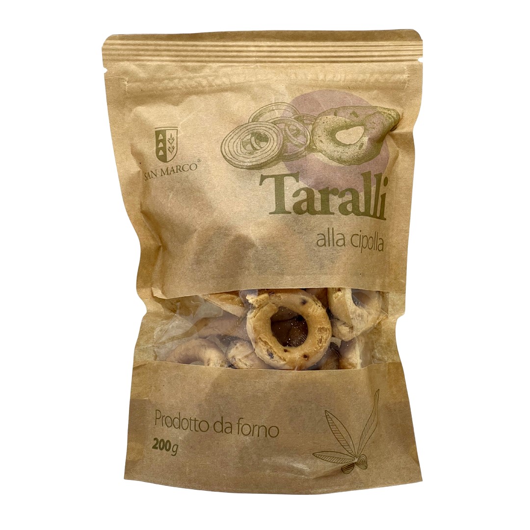 Scegli i taralli pugliesi alla cipolla 200 g Oleificio San Marco e porta sulla tua tavola uno snack rustico, fragrante e ricco di gusto.